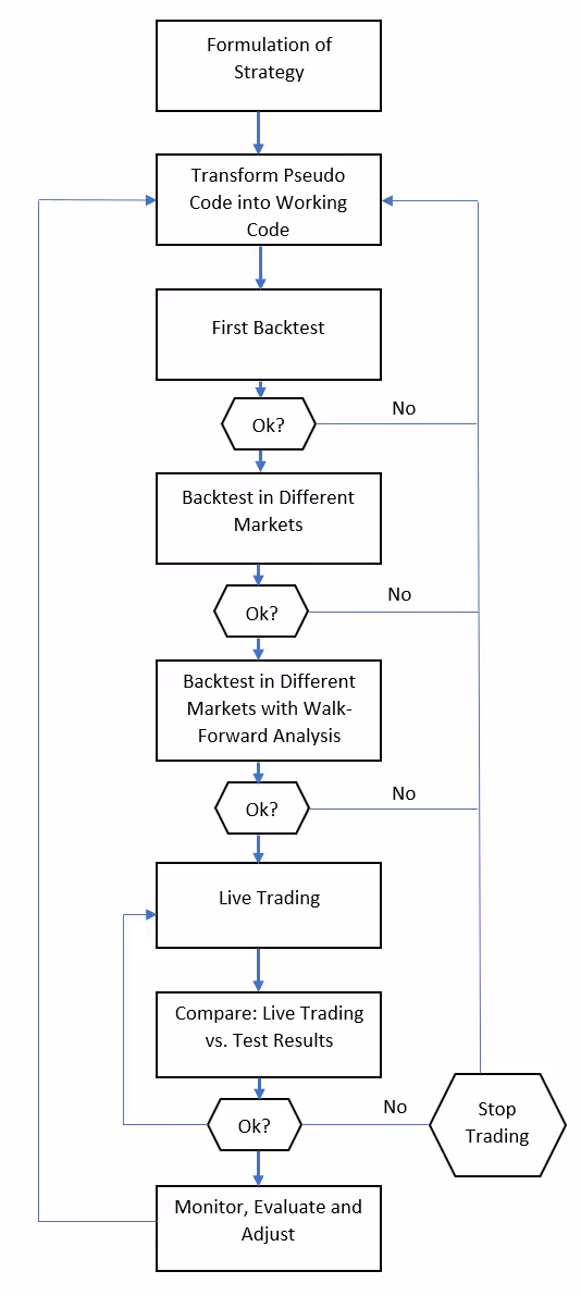 Developing a trading strategy from start to finish is a complex process. The process follows the following steps: