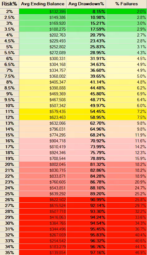 Running 1,000 simulations of random trades where each simulation starts with $100,000 and trades for four years gives us the following risk profile.