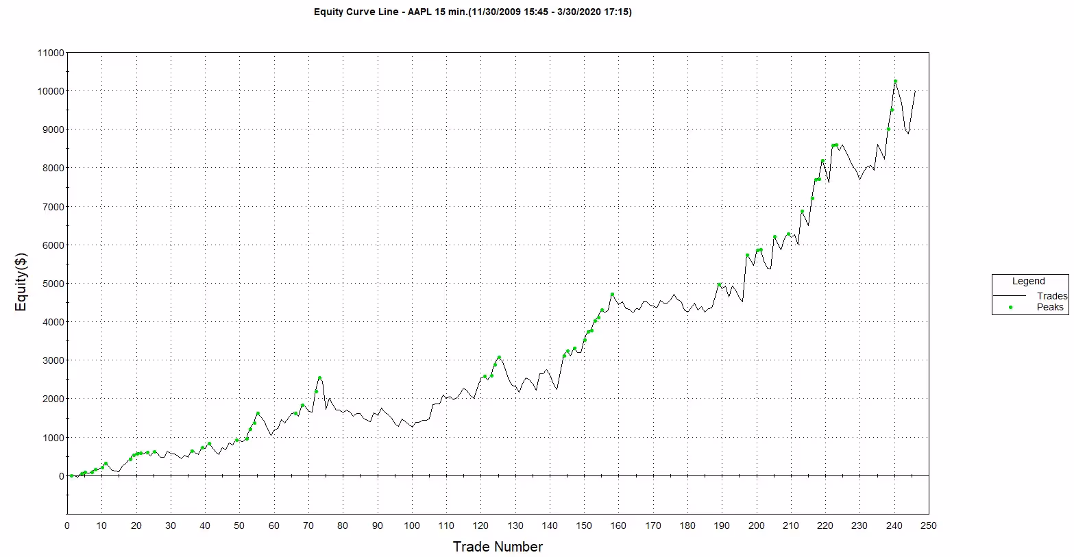 The time frame tested was from November 30, 2009 until March 30, 2020. Other parameters we considered were commission per trade $5, Initial Capital $100,000, Interest Rate 2% (you wish), entire order is filled when trade occurs at limit price or better. Backtesting the strategy for ticker: AAPL with no optimization run we got following results: